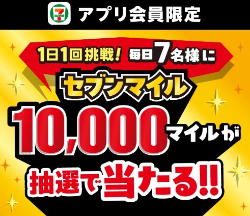 懸賞情報その場で当たる毎日7名様にセブンマイル10,000マイルが当たる豪華アプリ懸賞 懸賞名:【アプリ限定】1日1回挑戦!セブンマイル10,000マイルが抽選で当たる!当選賞品:セブンマイル 10,000マイル当選人数:毎日7名様応募条件:会員登録して応募企業名:セブン‐イレブン この懸賞に応募する2026年04月30日(残り28日) 見逃せない懸賞PayPayポイント 3,000円相当1,000名様えらべるPay 500円分 or ミニチュアチャーム1,000名様Panasonic 電気圧力鍋 / Nintendo Switch / LOGOS ポップフルシェルター 他1名様 / 1名様 / 1名様 他ヘナカラートリートメント無料サンプル応募者全員マルタイ商品詰め合わせ 5,000円相当1,000名様子どもにピッタリの教材が見つかる!幼児向け教材をまとめました♪ 応募可能な懸賞関連する当選報告 サッカー日本代表オリジナルユニフォームが当たるクローズドキャンペーン残り18日毎月抽選!Amazonギフト券2,000円分が当たる、在庫車両問い合わせキャンペーン毎月開催毎月抽選!現金5万円やギフトカードがもらえる川柳投稿キャンペーン☆毎月開催グルメやコスメなどが当たる豪華会員限定キャンペーン!賞品によって異なります最大1,000ポイント分のLINEポイントがその場で当たるキャンペーン!締切日不明Calbeeポテトチップス50周年を記念したグッズが当たるXキャンペーン残り3日 愛知トヨタのキャンペーンで「ドライブスルーギフトセット」が当選しました!マックスバリュ東海×森永製菓のハガキ懸賞で「木下大サーカス招待チケット」が当選しました♪Suntory「伊右衛門特茶カフェインゼロ 6本セット」が当選しました♪メットライフ生命保険「HUG YOUR SMILE キャンペーン」エスビー食品のキャンペーンで「京橋千疋屋 季節の果物詰め合わせ」が当選しました♪伊藤ハムのハガキ懸賞で「伝承 ハムギフトセット」が当選しました! 関連情報: オープン懸賞毎日応募その場で当たるネット懸賞豪華・高額懸賞現金・金券・ギフト券懸賞情報 高額賞品・高級品商品券・ギフト券・金券会員登録セブンイレブン HOME懸賞情報応募方法ネット懸賞毎日7名様にセブンマイル10,000マイルが当たる豪華アプリ懸賞 2026年04月02日 更新:ものりんず@懸賞主婦【厳選】毎日応募 【全て】毎日応募