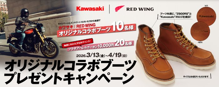 懸賞情報“Z900RS”と”Kawasaki”のロゴを焼印したオリジナルコラボブーツが当たる豪華懸賞 懸賞名:REDWING オリジナルコラボブーツプレゼントキャンペーン当選賞品&当選人数:賞品:オリジナルコラボブーツ(10名様)Wチャンス:プラザアパレル購入サポートクーポン 1万円分(20名様)応募条件:アンケートに答えて応募企業名:カワサキ この懸賞に応募する2026年04月19日(残り13日) 見逃せない懸賞電子マネー 最大10,000円分2,330名様メリーズ おむつ無料サンプル毎月7,500名様日本旅行で使えるクーポン対象者全員プリキュアグッズ9,000名様Amazonギフトカード 200円分1,000名様はじめてのベビースタイ応募者全員 応募可能な懸賞関連する当選報告 宿泊券やグルメ、観覧チケットなども当たるテレビ大阪のプレゼントキャンペーン!随時開催(賞品によって異なります)【関西スーパー×ニッポンハム】キッザニア甲子園入場券プレゼントキャンペーン残り2日ドーミーイン・共立リゾートの無料宿泊券も当たる豪華キャンペーン残り18日ディズニー・オン・アイス “Let’s Party!”公演チケットが当たる豪華会員限定キャンペーン残り39日リーゼのカラーシャンプーがその場で30名様に当たるキャンペーン残り3日【LINE懸賞】3,000円相当のベルーナグルメ商品が当たるキャンペーン!毎月開催 大阪王将のTwitter懸賞で「QUOカード 5,000円分」が当選しました♪3Mジャパンのハガキ懸賞で「ハーゲンダッツ ミニカップセット」が当選しました♪「キッザニア招待券」が日世のキャンペーンで当選しました!SAPPORO「ホワイトベルグ12本」が当選しました☆サントリー「ROLLING HOP」モニターが当選しました!テレビ愛知「妖怪マジック ペアチケットプレゼント」 関連情報: オープン懸賞ネット懸賞豪華・高額懸賞現金・金券・ギフト券懸賞情報ファッション・アクセ・貴金属 バッグ・靴・アクセサリー高額賞品・高級品商品券・ギフト券・金券WチャンスKawasaki|カワサキ HOME懸賞情報応募方法ネット懸賞“Z900RS”と”Kawasaki”のロゴを焼印したオリジナルコラボブーツが当たる豪華懸賞 2026年04月03日 更新:ものりんず@懸賞主婦【厳選】毎日応募 【全て】毎日応募