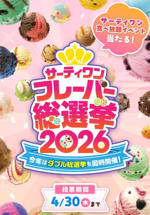 懸賞情報 サーティワン貸切食べ放題イベント招待も当たる投票キャンペーン 懸賞名:サーティワン フレーバー総選挙 2026当選賞品&当選人数:サーティワン eGift1,000円(毎日5名様)A賞:サーティワン貸し切り食べ放題イベント(50組100名様)B賞:バラエティボックス レギュラー8コ入ギフト券(31名様)などなど賞品多数!応募条件:アンケートに答えて応募企業名:B-R サーティワンアイスクリーム この懸賞に応募する2026年04月30日(残り24日) 見逃せない懸賞 フライパンセット / 手のりたまクッション / 丸美屋商品セット毎週250名様 / 毎週250名様 / 5,000名様デジタルギフト 500円相当 / 特製鍋焼うどん / 鍋島焼のプレミアムどんぶり10,000名様 / 2,000名様 / 300名様コズレオリジナルデザイン「出生届」メルマガ登録して必ずもらえるPayPayポイント 2,000円分1,000名様NO LIMIT!!パレード 特別鑑賞エリア入場券 / 25周年限定グッズ / JCB エクスプレス・パス1毎日最大5名様 / 毎日最大5名様 / 毎日最大20名様デジタルギフトカード 最大1万円分936名様 応募可能な懸賞 関連する当選報告 1万円分のQUOカードが当たるローソンの豪華X懸賞!不定期開催QUOカード500円分が当たる森永の感想を送ろうキャンペーン残り24日毎週開催☆めざましテレビで紹介されたお花が当たるキャンペーン定期開催ミルクマニアが30名様にその場で当たるXキャンペーン(本日最終日!!)こだわり酒場のオリジナルグッズや商品が当たるポイントキャンペーン!毎月末日【定期開催】豪華家電が当たる!ヨドバシカメラ梅田店のX懸賞不定期開催 キユーピー×はごろもフーズのハガキ懸賞で「シーチキン食堂セット」が当選しました♪日本ピュアフード「新商品『肉どれ』の試食モニター」ママこえのキャンペーンで「Le Creuset ティーポット&マグセット」が当選しました!JAタウンのTwitter懸賞で「黒毛和牛ロースステーキ」が当選しました!スギヨのハガキ懸賞で「香り箱・本格和風だし」が当選しました♪GOO.N MOM コミュニティの懸賞で「おむつ1パック」が当選しました☆ 関連情報: オープン懸賞毎日応募ネット懸賞豪華・高額懸賞現金・金券・ギフト券懸賞情報 お菓子・スイーツ・デザートギフトコード|デジタルギフトサーティワンアイスクリーム HOME懸賞情報応募方法ネット懸賞サーティワン貸切食べ放題イベント招待も当たる投票キャンペーン 2026年04月03日 更新:ものりんず@懸賞主婦 【厳選】毎日応募 【全て】毎日応募