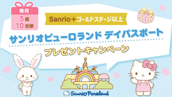 懸賞情報毎月開催!サンリオピューロランド デイパスポートが当たる会員限定キャンペーン 懸賞名:毎月実施!サンリオピューロランド デイパスポートが当たるプレゼントキャンペーン☆当選賞品:サンリオピューロランド デイパスポート当選人数:毎月5組10名様応募条件:会員登録して応募企業名:サンリオ この懸賞に応募する毎月10日〜24日(毎月開催) 見逃せない懸賞えらべるPay 100ポイント30,000本ブラックニッカクリアハイボール缶 無料引換券10,000名様ベルメゾンのおすすめ商品(毎週変動)賞品によって異なりますJリーグ観戦チケット合計150,000名様真空断熱ケータイマグ1,000名様オリジナル名入れ絵本ダウンロードデータ対象者全員 応募可能な懸賞関連する当選報告 アフタヌーンティーが楽しめるカタログギフトが当たるP&Gのクローズド懸賞残り22日Wチャンスもアリ!ネオバタくんトースターが当たるフジパンのハガキ懸賞2026年06月08日(全3回抽選)EJOICAセレクトギフトがその場で当たる、バンダイの商品アンケートキャンペーン!毎月開催エアウィーヴのキャリークッションが当たるスジャータのハガキ懸賞残り15日1万名様にサントリーサプリ無料お試しモニターのチャンス定期開催(休止期間あり)ブラックサンダールアー&ブラックサンダーがその場で当たるキャンペーン締切日不明 アピタ×ニッポンハムのキャンペーンで「ニッポンハムグループ商品詰め合わせ」が当選しました!DCMホールディングス&マンダムのハガキ懸賞で「ギフトカード 5,000円分」が当選しました☆コクヨのTwitter懸賞で「一愼 鰻のひつまぶし」が当選しました☆小野万のハガキ懸賞で「小野万製品詰め合わせセット」が当選しました☆BLEND BERRYのX懸賞で「アイシャドウパレットセット」が当選しました!白元アースのハガキ懸賞で「Amazonギフト券5,000円分」が当選しました! 関連情報: オープン懸賞ネット懸賞その他テーマパークチケット・招待券遊園地・テーマパーク・イベント懸賞情報毎月・毎週・定期懸賞 アニメ・キャラクターテーマパーク・レジャースポット高額賞品・高級品特別な体験|夢の実現招待券・入場券・チケット会員登録サンリオ HOME懸賞情報応募方法ネット懸賞毎月開催!サンリオピューロランド デイパスポートが当たる会員限定キャンペーン 2026年04月14日 更新:ものりんず@懸賞主婦【厳選】毎日応募 【全て】毎日応募