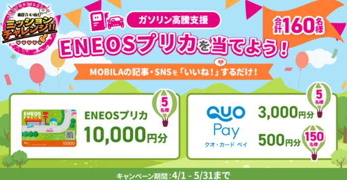 懸賞情報ENEOSプリカやQUOカードPayが当たるスタンプキャンペーン 懸賞名:\ガソリン高騰支援!/「いいね!」するだけ!ENEOSプリカ10,000円分が当たる!合計160名様にプレゼント!当選賞品&当選人数:ENEOSプリカ 10,000円分(5名様)QUOカードPay 最大3,000円分(155名様)応募条件:会員登録して応募企業名:AUTOBACS この懸賞に応募する2026年05月31日(残り52日) 見逃せない懸賞紅(あか)の伊右衛門 無料引換クーポン300名様Amazonギフトカード 最大1万円分1,000名様ディズニグッズ賞品によって異なりますオリジナル浴衣風Tシャツ / ギフトペイ 10円分1,500名様 / 98,500名様ローソンオリジナルチルド飲料カフェラテ無料券毎日1万名様母子手帳ケース / しかけ絵本 / Amazonギフト券 5,000円分 他応募者全員 / 応募者全員 / 毎月10名様 他 応募可能な懸賞関連する当選報告 EDWIN 特製ブルーGジャンなどが当たるキリンビールのクローズド懸賞残り15日ピジョン商品が当たるLINE友だち限定キャンペーン残り32日ファミリアグッズが300名様に当たるネスレのレシートキャンペーン残り67日キッザニア東京チケットや加湿空気清浄機なども当たるアンケートキャンペーン残り36日ファンケルの免疫サポート 粒タイプがお試しできる商品モニターキャンペーン残り10日ちはやふるアクスタやお米なども当たるサントリー自販機キャンペーン残り50日 「ハロウィンメイク動画・写真コンテスト」でAmazonギフト券が当選♪宇治田原製茶場「こいまろインテリアバスケット」が当選しました♪第2広報室「株式会社はつが cocomero 無料サンプル」サッポロビールのX懸賞で「ヱビス シトラスブラン」が当選しました!コノミヤのクローズド懸賞で「お楽しみセット」が当選しました!キューピー「キューピー製品詰め合わせ」が当選しました☆ 関連情報: オープン懸賞ネット懸賞豪華・高額懸賞現金・金券・ギフト券懸賞情報コツコツ懸賞・ポイ活 高額賞品・高級品商品券・ギフト券・金券電子マネー・ポイントQUOカードPay会員登録ENEOS HOME懸賞情報応募方法ネット懸賞ENEOSプリカやQUOカードPayが当たるスタンプキャンペーン 2026年04月09日 更新:ものりんず@懸賞主婦【厳選】毎日応募 【全て】毎日応募