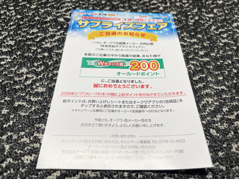 オークワのキャンペーンで「オーカードポイント200ポイント」が当選しました!