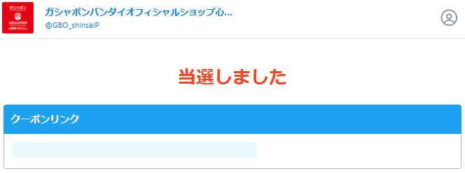 ガシャポンバンダイオフィシャルショップ心斎橋PARCO店のX懸賞で「e-GIFT500円分」が当選しました!