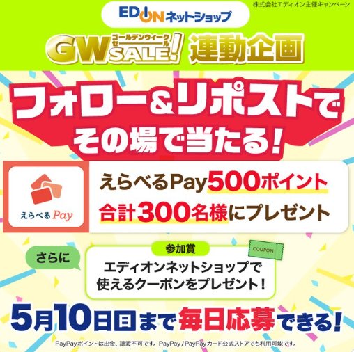 懸賞情報その場で当たるえらべるPay500ポイントがその場で300名様に当たるXキャンペーン 懸賞名:GWセール連動企画当選賞品:えらべるPay 500ポイント当選人数:300名様応募条件:X(Twitter)アカウントで毎日その場で当たる企業名:エディオン この懸賞に応募する2026年05月10日(残り16日) 見逃せない懸賞平野紫耀オリジナルQUOカード4,000名様カラーリングアイブロウ サンプル15,000名様母子手帳ケース / しかけ絵本 / Amazonギフト券 5,000円分 他応募者全員 / 応募者全員 / 毎月10名様 他カゴメトマトの苗7,000名様ビューティープロ ドッグ パウダフル3,000名様はじめてのベビースタイ応募者全員 応募可能な懸賞関連する当選報告 ディズニーシーのプライベート・イブニング・パーティーチケットが当たる豪華懸賞残り21日全プレ☆佃煮詰め合わせや図書カードももらえるお楽しみ券キャンペーン!締切日不明毎週開催!もち吉の会員限定プレゼントキャンペーン残り5日ブタメンオリジナル電気ケトルが当たるおやつカンパニーのハガキ懸賞2026年10月31日(毎月末日締め切り)Wチャンスもアリ!デジタルギフトが当たるニッスイのクローズド懸賞残り37日【京王ストア×伊藤ハム】USJ 1デイ・スタジオ・パスや商品券が当たるレシートキャンペーン残り42日 オークワ×マルハニチロのネットクローズド懸賞で「特大生タラバ蟹1kg」が当選しました!キユーピー×はごろもフーズのハガキ懸賞で「シーチキン食堂セット」が当選しました♪モニプラで「ナガシマスパーランド 親子ペアチケット」が当選しました☆イオン×アサヒのクローズド懸賞で「カルピスギフト」が当選しました!バロー×ヤマザキビスケットのハガキ懸賞で「商品券 2,000円分」が当選しました♪牛角のTwitter懸賞で「食事券 3,000円分」が当選しました♪ 関連情報: X懸賞(Twitter懸賞)オープン懸賞毎日応募ネット懸賞その場で当たる現金・金券・ギフト券SNS懸賞懸賞情報 電子マネー・ポイントエディオン HOME懸賞情報応募方法SNS懸賞X懸賞(Twitter懸賞)えらべるPay500ポイントがその場で300名様に当たるXキャンペーン 2026年04月24日 更新:ものりんず@懸賞主婦【厳選】毎日応募 【全て】毎日応募