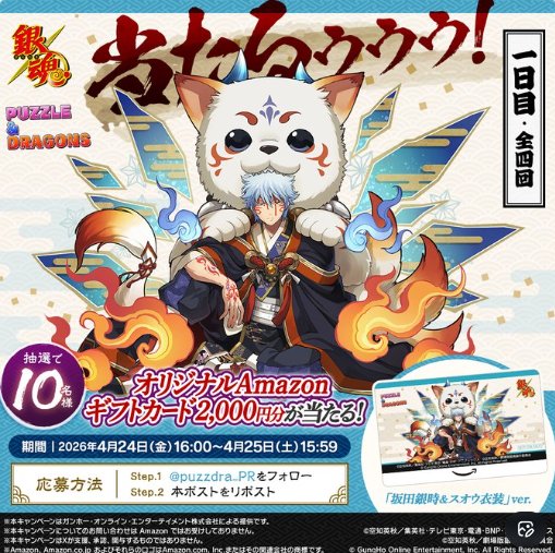 懸賞情報Amazonギフトカード2,000円分が当たる毎日応募Xキャンペーン 懸賞名:パズドラ『銀魂』コラボリポストキャンペーン!当選賞品:Amazonギフトカード 2,000円分当選人数:毎日10名様応募条件:X(Twitter)アカウントで毎日応募企業名:パズル&ドラゴンズ この懸賞に応募する2026年04月28日 15時59分(残り1日) 見逃せない懸賞メリーズ おむつ無料サンプル毎月7,500名様敏感肌用オールインワンジェル お試し無料モニター応募者全員しまじろうグッズ / JCBギフトカード 1,000円分合計200名様 / 400名様Freciousお試しパック20,000名様ムッシュ熊雄ヨギボー / キャンバスミニトート20名様 / 980名様電動自転車 / ベビーラック / iRobot ルンバ ほか合計1,098名様 応募可能な懸賞関連する当選報告 毎月開催!明治ポイントが当たる大量当選レシート懸賞2026年05月07日(全3回開催)46名様にディズニーグッズが当たる会員限定キャンペーン残り34日【定期開催】豪華家電が当たる!ヨドバシカメラのX懸賞定期開催テンスターのカラーシャンプーがお試しできる得なキャンペーン!締切日不明Wチャンスもアリ!デジタルギフトが当たるニッスイのクローズド懸賞残り34日【定期開催】映画関連グッズが当たるユナイテッド・シネマのX懸賞随時開催 ツルハ×クラシエのハガキ懸賞で「クラシエ商品詰め合わせ」が当選しました☆HOT PEPPER Beauty × ポンパレ「春のパーマスタイル × リーゼ特別プレゼント企画」に当選しました☆ヤマナカ×マルハニチロのハガキ懸賞で「美味しさ鍋Festa 招待券」が当選しました!コノミヤ×AGFのキャンペーンで「KANIEベーカリー 朝食パン大人気セット」が当選しました♪REGZAのTwitter懸賞で「一休.comギフトクーポン10,000円分」が当選しました!西友・LIVIN・サニー×サントリー×ロッテ×カルビー×フリトレーのハガキ懸賞で「ワイヤレスヘッドホン」が当選しました♪ 関連情報: X懸賞(Twitter懸賞)オープン懸賞毎日応募ネット懸賞現金・金券・ギフト券SNS懸賞懸賞情報 Amazonギフト券商品券・ギフト券・金券 HOME懸賞情報応募方法SNS懸賞X懸賞(Twitter懸賞)Amazonギフトカード2,000円分が当たる毎日応募Xキャンペーン 2026年04月27日 更新:ものりんず@懸賞主婦【厳選】毎日応募 【全て】毎日応募