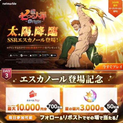 懸賞情報その場で当たる最大10,000円分のえらべるPayがその場で当たるXキャンペーン 懸賞名:エスカノール登場記念当選賞品:えらべるPay 最大10,000円分当選人数:700名様応募条件:X(Twitter)アカウントで毎日その場で当たる企業名:七つの大罪:Origin この懸賞に応募する締切日不明 見逃せない懸賞楽天ポイント 1,000ポイント1,000名様カレ・ド・ショコラ <スペリオリテ>毎月900名様デジタルギフトカード 最大1万円分936名様1デイ・スタジオ・パス+特別鑑賞エリア入場券 / 1デイ・スタジオ・パス / グッズセット 他100組200名様 / 1,050組2,100名様 / 200名様 他えらべるPay 最大35,000円分、ニッケオリジナルグッズセット など不明電動自転車 / ベビーラック / iRobot ルンバ ほか合計1,098名様 応募可能な懸賞関連する当選報告 毎月2,000名様にデジタルギフトが当たる大量当選クローズド懸賞締切日不明ジョージアのスタッキングマグが3,000名様に当たるキャンペーン残り20日世界で一つだけのオリジナル名入れ絵本を作れる会員登録キャンペーン常時募集中JA松山市農産物セットや久万高原町特産品セットなどが当たるキャンペーン残り64日毎月抽選!現金1万円やオリジナルグッズなどが当たるレシートキャンペーン2026年12月31日(毎月抽選)いわての乳製品セットやオリジナルQUOカードなどが当たるJA全農いわてのクローズド懸賞残り11日 花王「Curel 泡ボディウォッシュ+ジェルローション」が当選しました!明治のクローズド懸賞で「オリゴスマートセット」が当選しました!オークワ×岩塚製菓のハガキ懸賞で「国産米100%米菓詰め合わせ」が当選しました☆PLANT×キリンのハガキ懸賞で「伊勢赤どり味噌漬け」が当選しました!P&G「myレシピ.com『オトナのコミュニティ オトナの知恵の輪』」タカラトミー「リカちゃんをはじめよう!ドリームキャンペーン」 関連情報: X懸賞(Twitter懸賞)オープン懸賞毎日応募その場で当たるネット懸賞豪華・高額懸賞現金・金券・ギフト券SNS懸賞懸賞情報 高額賞品・高級品電子マネー・ポイント HOME懸賞情報応募方法SNS懸賞X懸賞(Twitter懸賞)最大10,000円分のえらべるPayがその場で当たるXキャンペーン 2026年04月27日 更新:ものりんず@懸賞主婦【厳選】毎日応募 【全て】毎日応募