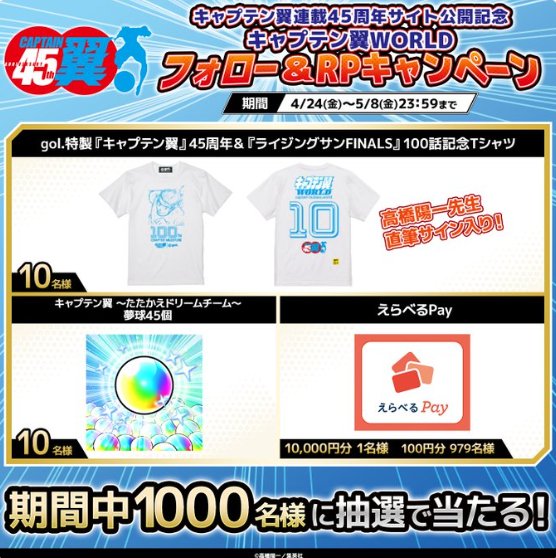 懸賞情報その場で当たるキャプテン翼TシャツやえらべるPayなどがその場で当たるXキャンペーン 懸賞名:キャプテン翼連載45周年サイト公開記念当選賞品&当選人数:キャプテン翼Tシャツ(10名様)えらべるPay 最大10,000円分(980名様)応募条件:X(Twitter)アカウントでその場で当たる企業名:キャプテン翼WORLD この懸賞に応募する2026年05月08日(残り11日) 見逃せない懸賞刺繍ハンカチ / 保冷バッグ&レジャーシート / エコバッグ / オリジナルかるた100名様 / 100名様 / 400名様 / 400名様ディズニーシー パークチケット対象者全員サイベックス ミオス ベビーカー / 洗えるベビー布団セット / パナソニック 電動自転車 他1名様 / 3名様 / 1名様 他貸切招待+トイ・ストーリーホテル宿泊券 / 貸切招待チケット / パークチケット50組100名様 / 合計4,450組12,900名様 / 1,000組2,000名様グーン製品 無料サンプル毎月6,000名様カタログギフト / Amazonギフトカード 500円分5名様 / 50名様 応募可能な懸賞関連する当選報告 【 遠鉄ストア×キユーピー】野菜収穫体験&工場見学が当たる豪華キャンペーン残り10日キッザニア東京チケットが600組1,200名様に当たるプレゼントキャンペーン残り14日マッサージアイテムやカタログギフトも当たるクローズドキャンペーン残り18日赤西仁さんのスペシャルビジュアルが当たるコーセーのクローズド懸賞残り18日毎月開催☆NISSEIオリジナルグッズが当たるキャンペーン♪毎月末日カラオケ・オブ・ザ・イヤーのセレモニー招待券が当たるJOYSOUNDの豪華懸賞!残り23日 グリコのキャンペーンで「ワンワン オリジナルスリーパー」が当選しました☆コカ・コーラ「GEORGIA コールドブリュー カフェラテ 1ケース」が当選しました♪花王「キュキュット ポンプの4本セット」が当選しました☆ジャパンフリトレーのキャンペーンで「チートス詰め合わせ」が当選しました!プロントのTwitter懸賞で「マ・マーあえるだけパスタソース&ステッカー」が当選しました!アピタ・ピアゴ・おやつカンパニーのハガキ懸賞で「ベビースタージグソーパズル」が当選しました♪ 関連情報: X懸賞(Twitter懸賞)オープン懸賞その場で当たるネット懸賞豪華・高額懸賞現金・金券・ギフト券SNS懸賞懸賞情報ファッション・アクセ・貴金属 ファッション・衣料品高額賞品・高級品電子マネー・ポイント HOME懸賞情報応募方法SNS懸賞X懸賞(Twitter懸賞)キャプテン翼TシャツやえらべるPayなどがその場で当たるXキャンペーン 2026年04月27日 更新:ものりんず@懸賞主婦【厳選】毎日応募 【全て】毎日応募