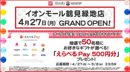 懸賞情報その場で当たる50名様にその場でえらべるPay500円分が当たるXキャンペーン 懸賞名:オープン記念キャンペーン当選賞品:えらべるPay 500円分当選人数:50名様応募条件:X(Twitter)アカウントで毎日その場で当たる企業名:ガシャポンバンダイオフィシャルショップイオンモール鶴見緑地店 この懸賞に応募する2026年05月06日(残り8日) 見逃せない懸賞オリエンタルカレーオリジナルグッズ毎月500名様デジタルギフト 2,000円分 / 丸美屋商品詰め合わせ毎月250名様 / 毎月750名様はじめてのベビースタイ応募者全員オリジナルカタログギフト / えらべるPay 500円分100名様 / 900名様QUOカード 3,000円分1,000名様サイベックス ミオス ベビーカー / 洗えるベビー布団セット / パナソニック 電動自転車 他1名様 / 3名様 / 1名様 他 応募可能な懸賞関連する当選報告 最高1,000万円分のトヨタホーム建築資金券が当たる家の懸賞2026年05月17日(全2回抽選)ティファールの厳選キッチン用品セットが当たるレビュー投稿キャンペーン2026年09月30日(全2回開催)クラウン賞受賞選手とのファンミーティングもできる豪華投票キャンペーン締切日不明クラブメッド・北海道 トマムの宿泊体験モニター募集キャンペーン残り1日毎月開催!3,000円分のAmazonギフトカードが当たるユーキャンレポキャンペーン2026年05月31日(毎月抽選)50名様にその場でえらべるPayが当たるXキャンペーン残り5日 オークワ・S&Bのハガキ懸賞で「ラ・ベットラ ティラミスセット」が当選しました♪レバンガ北海道のX懸賞で「ドリームヒル よくばりフレーバーセット」が当選しました!マックスバリュ中部×Nipponhamのハガキ懸賞で「スポーツタオルセット」が当選しました♪KOSEのTwitter懸賞で「ジュレームアミノ セット」が当選しました☆フィール×味の素×サントリーのハガキ懸賞で「メーカー商品詰め合わせ」が当選しました!ミツカンのInstagram懸賞で「ポン酢4種セット」が当選しました! 関連情報: X懸賞(Twitter懸賞)オープン懸賞毎日応募ネット懸賞その場で当たる現金・金券・ギフト券SNS懸賞懸賞情報 電子マネー・ポイントバンダイ HOME懸賞情報応募方法SNS懸賞X懸賞(Twitter懸賞)50名様にその場でえらべるPay500円分が当たるXキャンペーン 2026年04月28日 更新:ものりんず@懸賞主婦【厳選】毎日応募 【全て】毎日応募